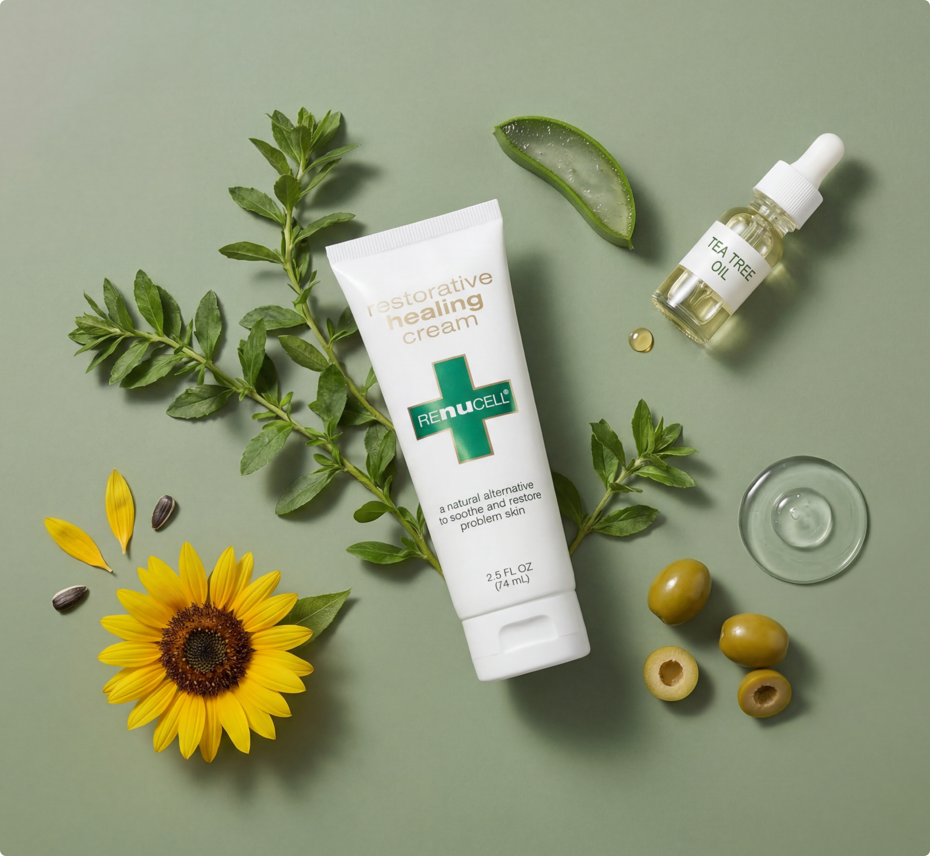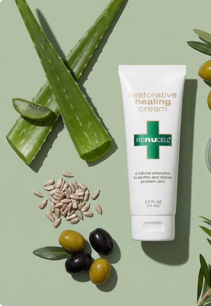 Renucell features proprietary PHYTOXOLIN™ alongside Aloe Vera, Sunflower Oil, Olive Oil, Tea Tree Oil, Glycerine, and other supporting ingredients chosen to nourish, hydrate, and support skin comfort.